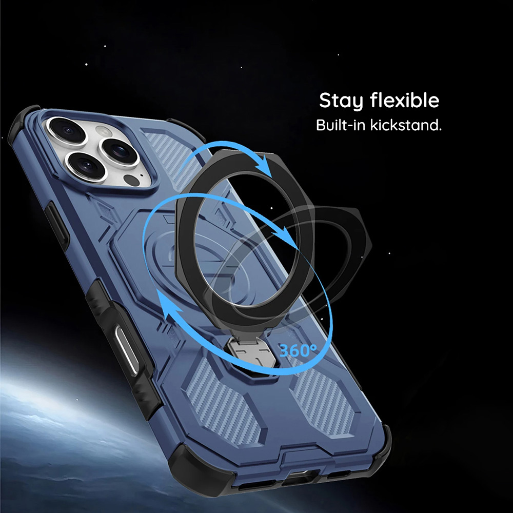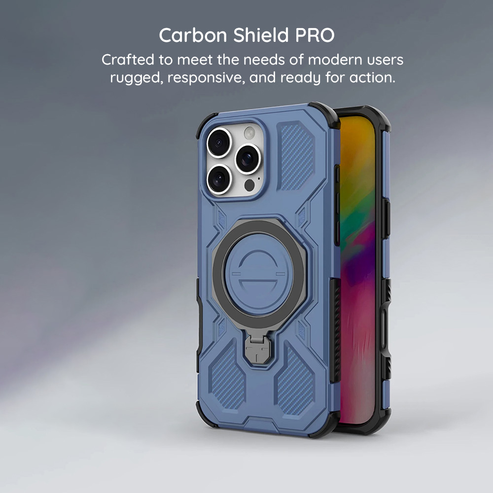 Το μοντέλο Carbon Shield ενσωματώνει κεντρικό στοιχείο από κράμα μετάλλων, συμβατό με μαγνητικά συστήματα συγκράτησης οχημάτων.