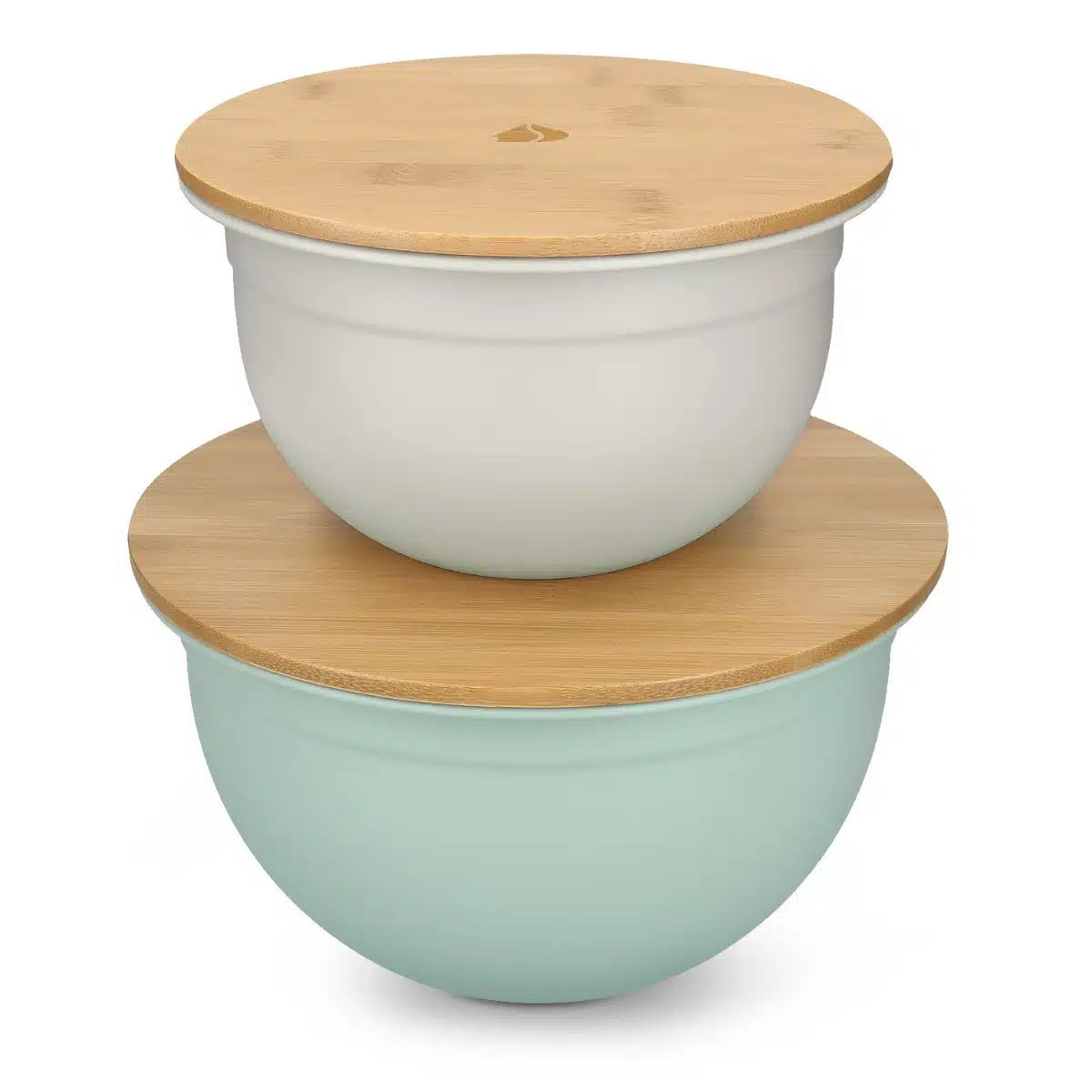 - Το σετ μπολ περιλαμβάνει ένα μικρότερο μπολ (1.5QT/1.4L) και ένα μεγαλύτερο μπολ (3QT/2.8L). Κάθε μπολ συνοδεύεται από καπάκι μπαμπού με σιλικόνη.