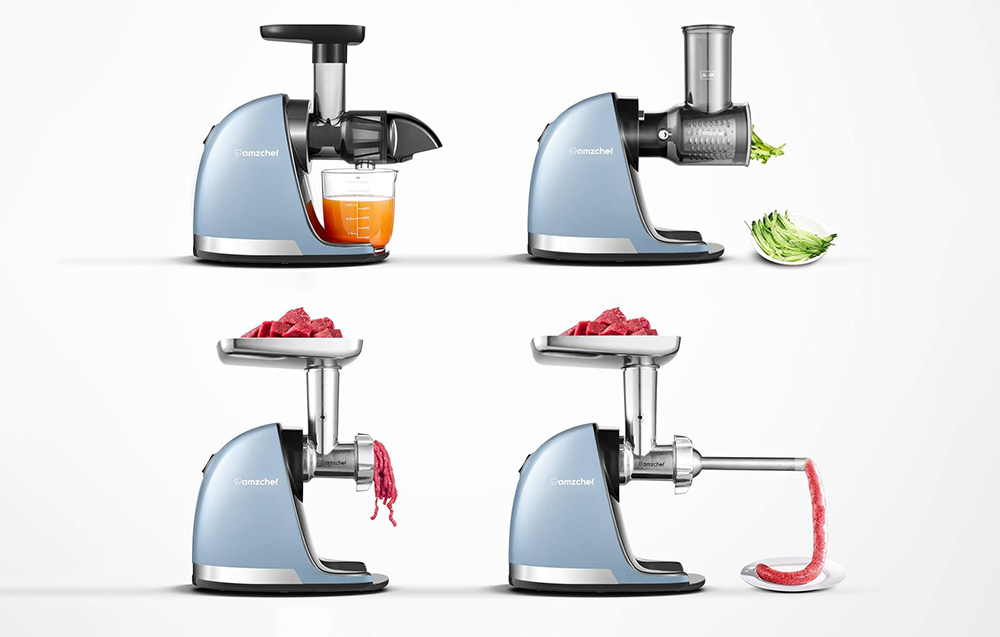 Το AMZCHEF 1501-BU-SM δεν είναι απλώς ένας αποχυμωτής! Η συσκευή λειτουργεί ως 4-σε-1, προσφέροντας τη δυνατότητα χρήσης αξεσουάρ όπως κόφτης, μύλος και γεμιστήρας λουκάνικων. Αν και αυτά τα αξεσουάρ δεν περιλαμβάνονται, διατίθενται εύκολα ξεχωριστά, δίνοντάς σας τη δυνατότητα να επεκτείνετε τη συσκευή και να γίνετε ακόμα πιο ευέλικτοι στην κουζίνα.